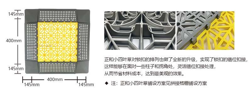 正和小四葉草采用通扣設(shè)計,可以確保產(chǎn)品鋪設(shè)完成后在任何區(qū)域單獨取出,極大的方便了客戶后期局部清理泥沙等,給店面的日常衛(wèi)生維護(hù)提供了很好的基礎(chǔ)。