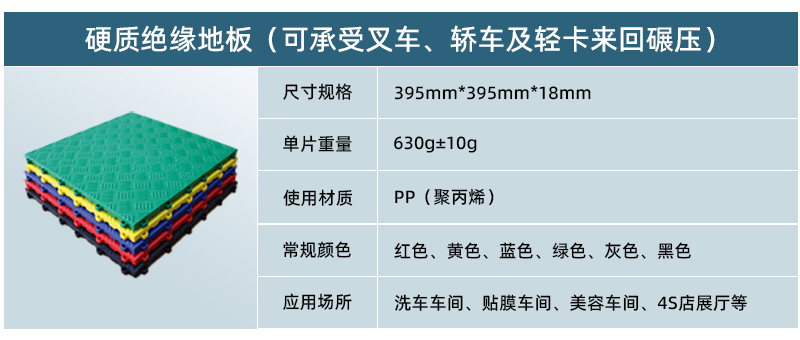 針對汽車快修車間、美容養(yǎng)護(hù)車間、汽車維修廠等區(qū)域,正和硬質(zhì)絕緣地板成為地面升級的全新選擇。正和硬質(zhì)絕緣地板下方密布數(shù)百個支撐點(diǎn),完全可以承受車輛的來回碾壓,具有安裝快速簡便、對基礎(chǔ)要求寬泛、容易清理等特點(diǎn) ,特別適用于車庫地面鋪設(shè)使用,也可作為產(chǎn)品展示的臨時展臺使用。 正和硬質(zhì)絕緣地板采用100%純新PP材料生產(chǎn)而成,無毒、無味、環(huán)保,可回收利用,也可以用于健身房、辦公室等商用領(lǐng)域地面使用。