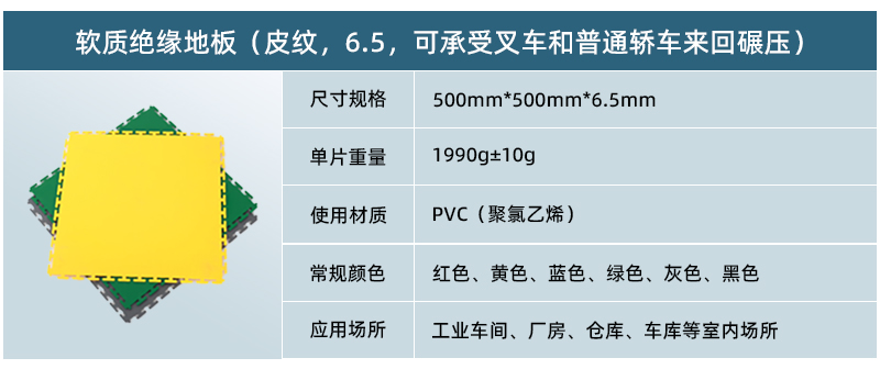 軟質(zhì)絕緣地板采用純新軟性PVC(聚氯乙烯)生產(chǎn)而成,具有防滑、防油、靜音、抗沖擊、高承載等特點(diǎn),可以快捷安裝在任何現(xiàn)有的基板,包括木材,混凝土,環(huán)氧樹脂,瓷磚,水磨石等,廣泛應(yīng)用于車間廠房地面、倉庫地面、車庫地面、健身房、展廳等場所。
